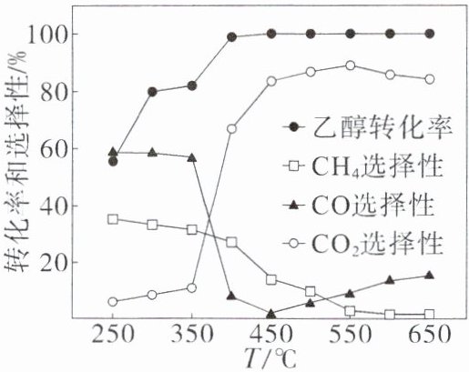 以${H_{2}O}$和${C_{2}H_{5}OH}$为原料气,通过装有催化剂的反应器,反应相同时间,乙醇转化率,${CH_{4}}$、${CO}$、${CO_{2}}$选择性随温度变化的曲线如图所示。下列说法不正确的是(