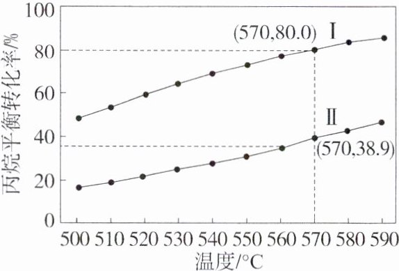 3.答案Ⅱ 0.018 解析 由关系式$x^{2}=\frac{K_{p}}{K_{p}+p}$可知,温度相同时,p越大,x越小,则0.10MPa下的关系曲线是Ⅱ;570℃时,0.010MPa时,丙烷平衡转化率x=80.0%,假设丙烷起始时物质的量为amol,可得三段式$: CH_{3}CH_{2}CH_{3}(g)\rightleftharpoonsCH_{2}=CHCH_{3}(g)+H_{2}(g) $开始/mol a 0 0 转化/mol 0.8a 0.8a 0.8a 平衡/mol 0.2a 0.8a 0.8a 总物质的量为1.8amol,则$K_{p}=\frac{p(H_{2})\cdot p(CH_{2}=CHCH_{3})}{p(CH_{3}CH_{2}CH_{3})}=\frac{(\frac{0.8a}{1.8a}×0.010MPa)^{2}}{\frac{0.2a}{1.8a}×0.010MPa}=\frac{16}{9}×0.010MPa≈0.018MPa。$
