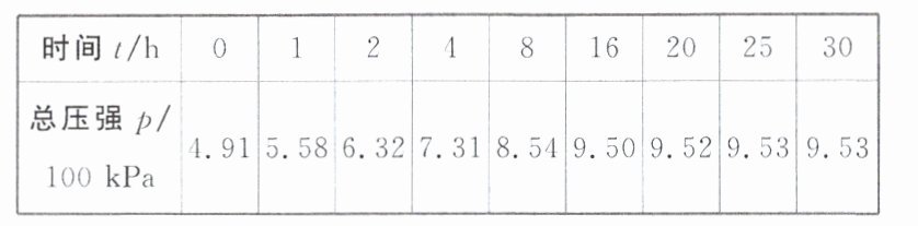 (2)压强之比等于气体的物质的量之比,依据三段式进行求解$: A(g)\rightleftharpoons B(g)+C(g) $始态$: p_{0}·α(A) 0 0 $反应终态$: p_{0}-p_{0}·α(A) p_{0}·α(A) p_{0}·α(A) p=p_{0}-p_{0}·α(A)+p_{0}·α(A)+p_{0}·α(A)=p_{0}+p_{0}·α(A), $求得$α(A)=(\frac{p}{p_{0}}-1)×100%;25h$时反应已平衡$,α(A)=(\frac{9.53}{4.91}-1)×100%≈94.1%。$
