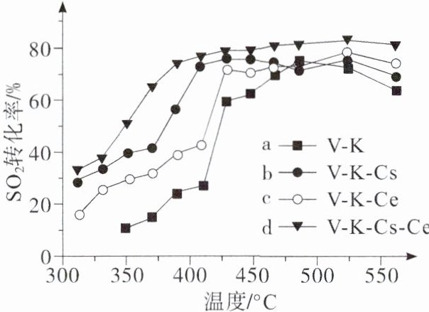 (2)结合图像可知,相对于a、b、c、d对应的催化剂随着温度的升高,SO₂的转化率升高得快,达到一定温度后趋于平缓。