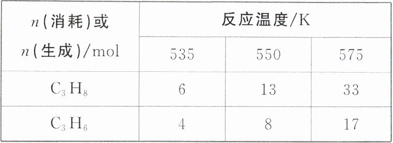 反应过程中消耗的$C_{3}H_{8}$和生成的$C_{3}H_{6}$的物质的量随温度的变化关系见下表。