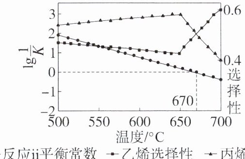 ① 反应ⅱ的平衡常数、产物丙烯选择性、副产物乙烯选择性与温度关系如图所示,分析工业生产中采用的温度为$650^{\circ}C$左右的原因是_________。