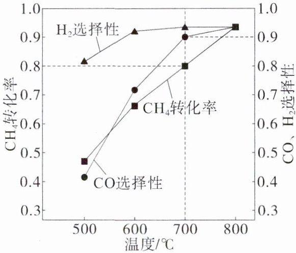 2.C 解析 由图可知,升温CH₄转化率增大,但不管反应是放热还是吸热,没有达到平衡时升温,正反应速率增大相同时间内CH₄转化率都会增大,所以不能判断反应是吸热反应,A错误;在700℃时,CH₄转化率为0.8,所以转化的CH₄为0.8×2mol = 1.6mol,据C守恒可知CO与CO₂共1.6mol,又CO的选择性为0.9,n(CO)=1.6mol×0.9 = 1.44mol,故n(CO₂)=0.16mol,B错误;对比500℃、600℃、700℃图中H₂、CO的选择性,H₂选择性变化较为平缓,CO选择性变化较大,说明还有反应生成H₂和CO,而且化学计量数之比和反应I不同,所以该反应可能是CH₄(g)+H₂O(g)⇌3H₂(g)+CO(g),C正确;800℃时H₂和CO的选择性接近1,说明高温有利于甲烷催化氧化为合成气反应的进行,即高温有利于合成气的生成,D错误。