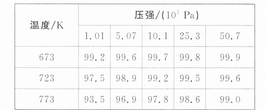 1. 已知:$2SO_{2}(g)+O_{2}(g)\rightleftharpoons 2SO_{3}(g)$ $\Delta H=-197.8kJ· mol^{-1}$。起始反应物为$SO_{2}$和$O_{2}$(物质的量之比为$2:1$,且总物质的量不变)。$SO_{2}$的平衡转化率($\%$)随温度和压强的变化如下表,下列说法不正确的是(