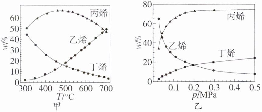 (1)由图甲可知,300℃时C₂H₄(g)的质量分数接近于0,而温度升高,C₂H₄(g)的质量分数增大,故选择300℃;由图乙可知,压强增大,C₂H₄(g)的质量分数减小,C₃H₆(g)的质量分数增大,故选0.5MPa,因此控制反应条件为300℃,0.5MPa。