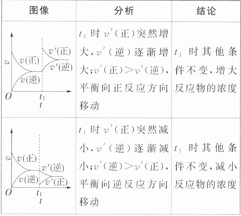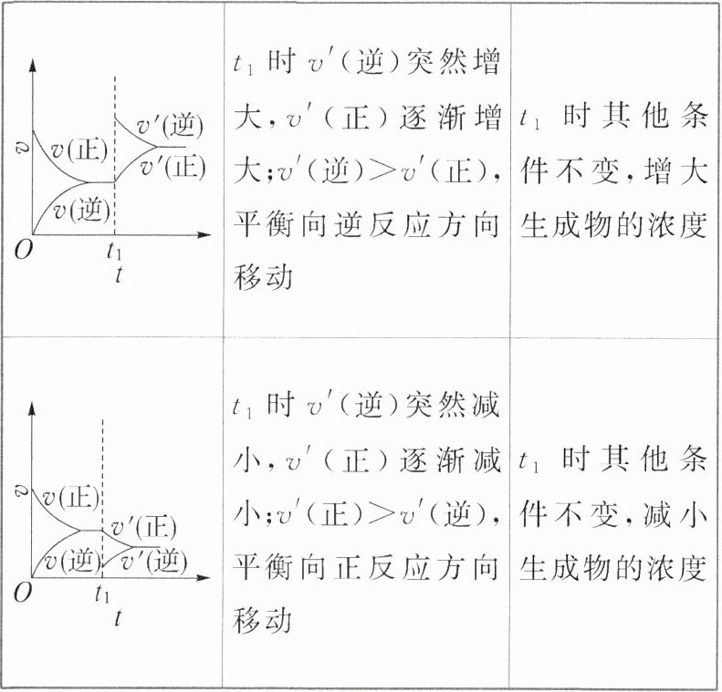 续表内容为:条件不变,增大生成物的浓度,平衡向逆反应方向移动;条件不变,减小生成物的浓度,平衡向正反应方向移动。