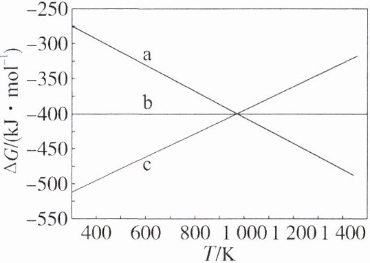 设$\Delta G=\Delta H - T\Delta S$,反应①、②和③的$\Delta G$随温度$T$的变化关系如图所示。图中对应于反应③的线条是