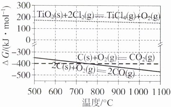 (1)由图可知,600℃时C(s)+O₂(g)⇌CO₂(g)的ΔG<0,反应自发进行,故A不符合题意;由图可知,600℃时2C(s)+O₂(g)⇌2CO(g)的ΔG<0,反应自发进行,故B不符合题意;由图可知,600℃时TiO₂(s)+2Cl₂(g)⇌TiCl₄(g)+O₂(g)的ΔG>0,反应不能自发进行,故C符合题意;根据盖斯定律,TiO₂(s)+C(s)+2Cl₂(g)⇌TiCl₄(g)+CO₂(g)可由C(s)+O₂(g)⇌CO₂(g)与TiO₂(s)+2Cl₂(g)⇌TiCl₄(g)+O₂(g)相加得到,再根据题给图像中的数据可得,600℃时其ΔG<0,反应自发进行,故D不符合题意。