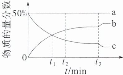 对点训练1 B 解析 开始时 N₂ 和 H₂ 各占 50%,总物质的量是 1mol,则 N₂ 和 H₂ 各为 0.5 mol,列三段式:N₂(g)+3H₂(g)⇌2NH₃(g)起始量/mol 0.5 0.5 0转化量/mol x 3x 2x某时刻总物质的量为 n(总)=(0.5 - x)mol+(0.5 - 3x)mol+2x mol=(1 - 2x)mol,某时刻 N₂ 的物质的量分数为 $\frac{(0.5 - x)mol}{(1 - 2x)mol}×100\% = \frac{1}{2}×\frac{(1 - 2x)mol}{(1 - 2x)mol}×100\% = 50\%$,故 N₂ 的物质的量分数一直保持不变(50%),则 a 代表 N₂ 的物质的量分数,随反应进行减小的是 c 表示的 H₂ 的物质的量分数,b 表示 NH₃ 的物质的量分数,A正确;t₁ 时 H₂、NH₃ 的物质的量分数相等,即 $\frac{(0.5 - 3x)mol}{(1 - 2x)mol} = \frac{2x mol}{(1 - 2x)mol}$,解得 x = 0.1,则 0~t₁ min,v(H₂)=$\frac{0.3}{Vt_1} mol·L⁻¹·min⁻¹$,B错误;b 代表 NH₃ 的物质的量分数,t₂ 时刻以后,NH₃ 的物质的量分数增大,说明反应向正反应方向进行,则 NH₃ 的分解速率小于其生成速率,C正确;t₃ 时刻,减小容积,压强增大,平衡正向移动,NH₃ 的物质的量分数增大,H₂ 的物质的量分数减小,D正确。