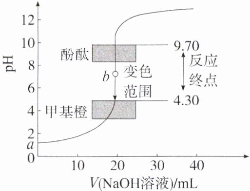例3 D 解析 b点在突变范围内,极少量NaOH溶液也会引起pH的突变,A正确;题图中反应终点的pH在4.30~9.70之间,选择指示剂的变色范围应在反应终点的pH范围内,B正确;醋酸是弱酸,等浓度时醋酸溶液的pH大于盐酸,滴定终点时醋酸钠溶液水解显碱性,曲线ab段将会上移,C正确;使用酚酞作指示剂,用同浓度氨水代替NaOH溶液,滴定终点时溶质为NH₄Cl,溶液显酸性,要使溶液由无色变为浅红色,pH在8.2~10之间,则消耗氨水的体积大于NaOH溶液,D错误。