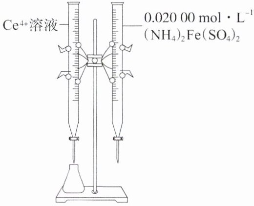 从左侧滴定管中放出一定体积的待测$\mathrm{Ce}^{4 + }$溶液,加入指示剂苯代邻氨基苯甲酸,用$0.02000\ \mathrm{mol\cdot L^{-1}}( \mathrm{NH_{4}} )_{2}\mathrm{Fe( SO_{4}} )_{2}$溶液来滴定,当滴入最后半滴标准液时,溶液由紫红色变为亮黄色,且半分钟不恢复原色,即达到滴定终点,记录标准液的体积