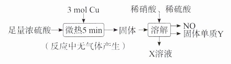 A 解析本题结合铜与浓硫酸的反应及产物的检测,考查氧化还原反应及其计算。铜与足量浓硫酸反应生成$Cu_2S$和白色物质X,无气体生成,生成$Cu_2S$时铜元素从0价升高到+1价,硫元素从+6价降低到-2价,根据得失电子数守恒,必定存在其他产物(所含元素化合价升高),按元素守恒分析只能为$CuSO_4$,则白色物质X为$CuSO_4$,配平得到该反应的化学方程式为$5Cu + 4H_2SO_4(浓)\stackrel{△}{=}3CuSO_4 + Cu_2S + 4H_2O$。白色物质X为$CuSO_4$,A正确;$Cu_2S$和$CuSO_4$加稀硫酸和稀硝酸时溶解,发生反应$3Cu_2S + 16H^+ + 4NO_3^- = 6Cu^{2+} + 3S↓ + 4NO↑ + 8H_2O$,单质Y为S,则NO为还原产物、Y(S)为氧化产物,B错误;由反应可知,硫元素从+6价降低到-2价时表现氧化性,则参加反应的浓硫酸中,表现氧化性的占25%,C错误;根据反应的化学方程式可知,3 mol Cu发生反应生成0.6 mol $Cu_2S$,0.6 mol $Cu_2S$发生反应$3Cu_2S + 16H^+ + 4NO_3^- = 6Cu^{2+} + 3S↓ + 4NO↑ + 8H_2O$可生成0.8 mol NO与0.6 mol S,故NO与S物质的量之和为1.4 mol,D错误。