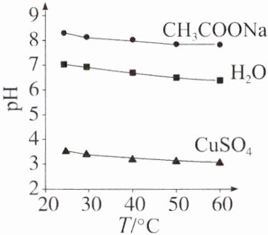 4. 实验测得0.5 mol·L⁻¹ CH₃COONa溶液、0.5 mol·L⁻¹ CuSO₄溶液以及H₂O的pH随温度变化的曲线如图所示。下列说法正确的是(