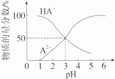 5. B 解析 由图像可知,$0.1mol\cdot L^{-1}H_2A$溶液全部电离为$HA^-$,说明第一步电离为完全电离,$HA^-$不水解,故A错误;$pH = 3$时,$c(A^{2-}) = c(HA^-)$,则$Na_2A$水解常数$K_h = \frac{c(OH^-)\cdot c(HA^-)}{c(A^{2-})} = 10^{-11}$,故B正确;$H_2A$全部电离,不存在$H_2A$分子,则由元素守恒可知,$c(A^{2-}) + c(HA^-) = 0.1mol\cdot L^{-1}$,故C错误;$H_2A\rightleftharpoons H^+ + HA^-$,电离常数$K_a = \frac{c(H^+)\cdot c(A^{2-})}{c(HA^-)}$,当$c(A^{2-}) = c(HA^-)$,$K_a = 10^{-3}$,$K_a > K_h(A^{2-})$,等物质的量浓度的$NaHA$、$Na_2A$等体积混合,$HA^-$的电离程度大于$A^{2-}$的水解程度,所得$c(HA^-) < c(A^{2-})$,故$pH > 3.0$,故D错误。