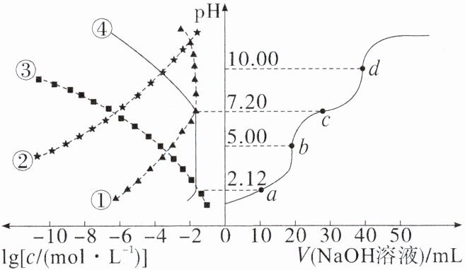 1. ($2024·$七省适应性测试广西化学,$14$)$0.1000mol\cdot L^{-1}NaOH$溶液滴定$20.00mL0.1000mol\cdot L^{-1}H_{3}PO_{4}$溶液时,$V(NaOH$溶液)、各含磷元素微粒的$\lg[c/(mol\cdot L^{-1})]$与$pH$的关系如图。下列说法中正确的是()