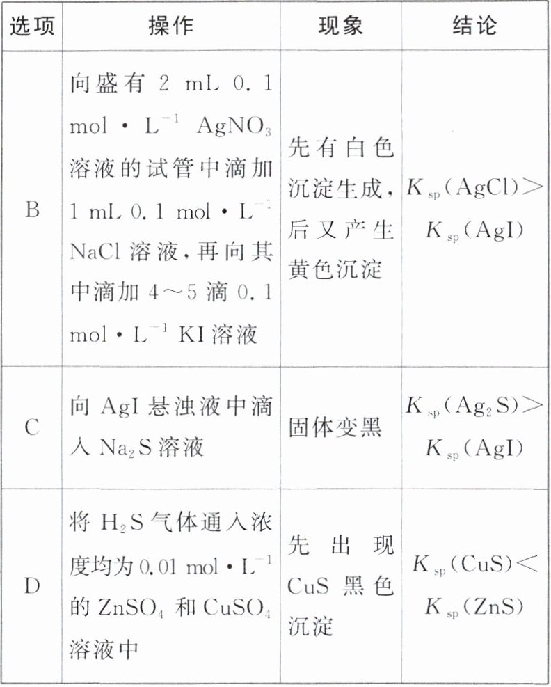 例1D 解析 生成的硫化氢会与硝酸银溶液反应生成硫化银沉淀,没有沉淀的转化,无法判断Kₛₚ(AgCl)、Kₛₚ(Ag₂S)的大小,A错误;AgNO₃溶液过量,KI直接与AgNO₃反应,无法判断Kₛₚ(AgCl)与Kₛₚ(AgI)的大小关系,B错误;溶度积常数大的物质能转化为溶度积常数小的物质,AgI悬浊液中滴入Na₂S溶液,固体变黑,Ag₂S与AgI虽属于不同类型的沉淀,但Kₛₚ(Ag₂S)与Kₛₚ(AgI)相差较大,故可以直接比较大小,说明Kₛₚ(Ag₂S)<Kₛₚ(AgI),C错误;难溶的物质先沉淀出来,说明Kₛₚ(CuS)<Kₛₚ(ZnS),D正确。