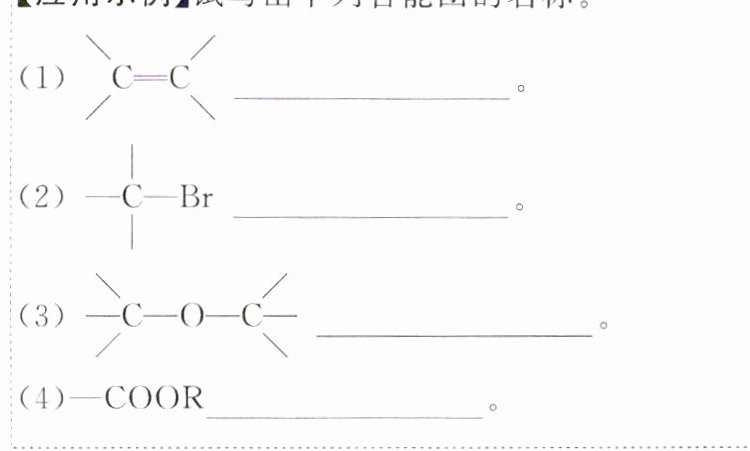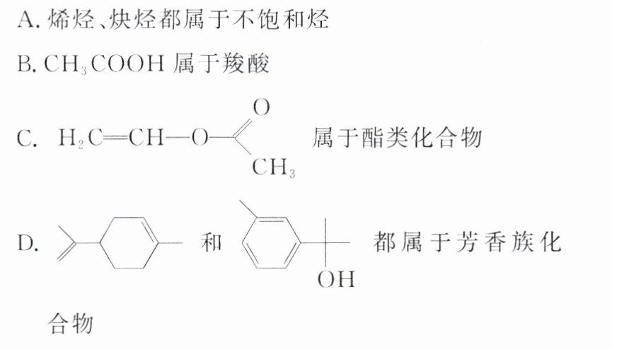 对点训练1D 解析烯烃、炔烃是含有碳碳不饱和键的烃,都属于不饱和烃,A正确;$\mathrm{CH_3COOH}$为乙酸,含有羧基,属于羧酸,B正确;$\mathrm{H_2C=CH-O- \overset{ \mathrm{O} }{ \underset{ \mathrm{ } }{C} } -CH_3}$的名称为乙酸乙烯酯,含有酯基,属于酯类化合物,C 正确;