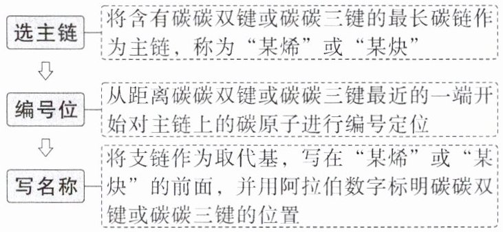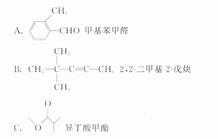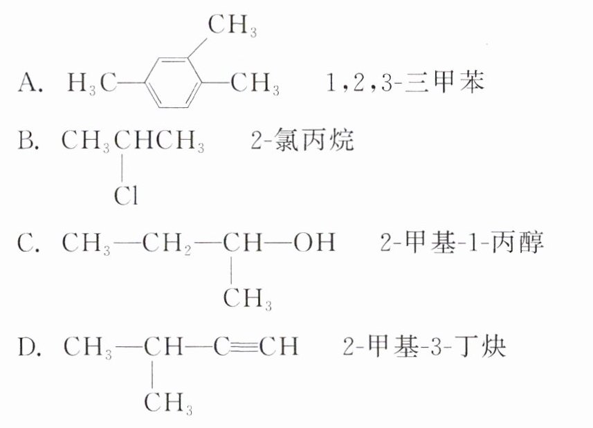 例2B 解析甲基的位置标错,应为1,2,4−三甲苯,A错误;主链选择错误,未选择含—OH的最长碳链作为主链,应为2 - 丁醇,C错误;碳原子编号错误,要从碳碳三键一端开始编号,应为3 - 甲基 - 1 - 丁炔,D错误。