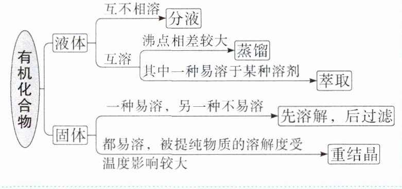对点训练1D 解析酒精与水的沸点相差少,部分水蒸气也会蒸发进入蒸馏液中,故A错误;酸性高锰酸钾溶液与乙炔反应生成二氧化碳,会引入新的杂质,故B错误;乙酸乙酯在$\mathrm{NaOH}$溶液里会发生水解,故C错误;苯甲酸是固体,在水中的溶解度受温度影响较大而氯化钠较易溶于水,所以可利用重结晶的方法将两者分离,故D正确。