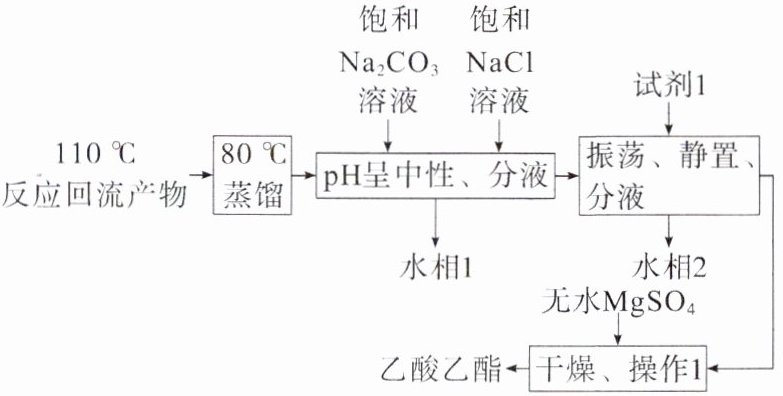 例1C 解析回流产物蒸馏,蒸馏产物加入饱和碳酸钠溶液调节pH、饱和氯化钠溶液洗涤分液,分液分离出有机相,加入饱和氯化钙溶液除去乙醇,分液分离出有机相,加入无水硫酸镁干燥,蒸馏分离得到乙酸乙酯。为保证反应回流效果,可以使用球形冷凝管,增加气体在冷凝管中的时间,达到更好的冷凝效果,A正确;饱和$\mathrm{Na_2CO_3}$溶液和饱和$\mathrm{NaCl}$溶液既能除杂又能降低酯的溶解度,利于除杂和酯的析出,B正确;试剂1是饱和氯化钙溶液,作用是除去乙醇,C错误;操作1为分离出乙酸乙酯的操作,为蒸馏,D正确。