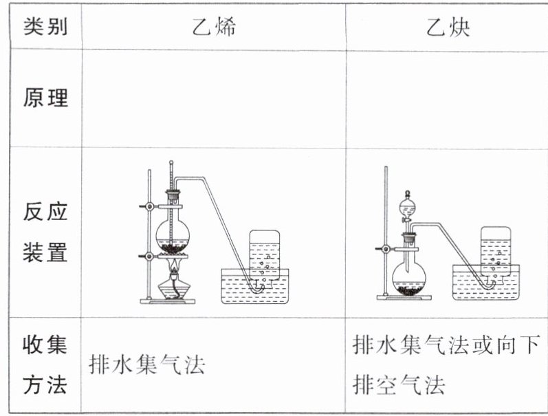 [注意]乙烯的制备中要迅速升温到170℃,以减少副产物乙醚的生成;乙炔的制备中,杂质气体H₂S等可用CuSO₄溶液除去。