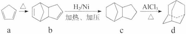 3.B 解析由结构可知b的分子式为$\mathrm{C}_{10}\mathrm{H}_{12}$,A项正确;a分子中有5个碳原子和4个氢原子可以在同一个平面内,B项错误;物质c与物质d的分子式相同、结构不同,互为同分异构体,C项正确;物质d中有两种不同化学环境的氢原子,其一氯代物只有两种,D项正确。