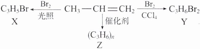 4.B 解析$\mathrm{CH}_{3}—\mathrm{CH}=\mathrm{CH}_{2}$与$\mathrm{Br}_{2}$的$\mathrm{CCl}_{4}$溶液发生加成反应,生成$\mathrm{CH}_{3}—\mathrm{CHBr}—\mathrm{CH}_{2}\mathrm{Br}$ (Y);$\mathrm{CH}_{3}—\mathrm{CH}=\mathrm{CH}_{2}$与$\mathrm{Br}_{2}$在光照条件下发生甲基上的取代反应,生成$\mathrm{CH}_{2}\mathrm{Br}—\mathrm{CH}=\mathrm{CH}_{2}$ (X);$\mathrm{CH}_{3}—\mathrm{CH}=\mathrm{CH}_{2}$在催化剂作用下发生加聚反应,生成$\mathrm{CH}_{2}-\mathrm{CH}_{2}$ (Z)。乙烯分子中有6个原子共平面,甲烷分子中最多有3个原子共平面,则丙