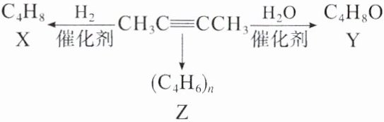 2.C 解析2 - 丁炔中含有三键,分子中最多有6个原子共面,A正确;X为2 - 丁炔加$\mathrm{H}_{2}$生成,根据分子式可知X中含有双键,为2 - 丁烯,与酸性$\mathrm{KMnO}_{4}$溶液反应可生成$\mathrm{CH}_{3}\mathrm{COOH}$,B正确;Y为2 - 丁炔与水发生反应获得,由于2 - 丁炔中三键位置不在两端,所以不会生成醛基,不可以发生银镜反应,C错误;Z是由2 - 丁炔聚合生成,Z中含有双键,所以存在顺式结构和反式结构,D正确。