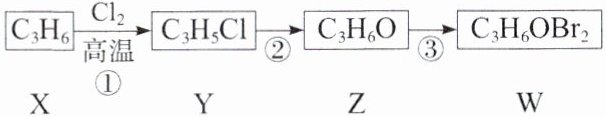 例1 B 解析 根据几种有机化合物分子组成和反应条件可得,X为$\mathrm{CH_3CH=CH_2}$,Y为$\mathrm{ClCH_2CH=CH_2}$,Z为$\mathrm{HOCH_2CH=CH_2}$,W为$\mathrm{HOCH_2CHBrCH_2Br}$,反应①②③分别为取代反应、取代反应、加成反应,选项A正确;反应②为卤代烃的水解反应,条件为NaOH的水溶液并加热,选项B错误;W在一定条件下可发生卤代烃的消去反应生成$\mathrm{CH≡C—CH_2OH}$,选项C正确;可由X通过如下三步反应制备甘油:$\mathrm{CH_3CH=CH_2 \xrightarrow{Cl_2,高温} ClCH_2CH=CH_2 \xrightarrow{Cl_2} ClCH_2CHClCH_2Cl \xrightarrow[△]{NaOH/水} HOCH_2CH(OH)CH_2OH}$,选项D正确。