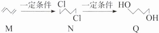 4.C 解析 A项,对比M、N的键线式,M生成N 的反应为加成反应,错误;B项,N的分子式为$\mathrm{C_4H_8Cl_2}$,$\mathrm{C_4H_8Cl_2}$为$\mathrm{C_4H_{10}}$的二氯代物,$\mathrm{C_4H_{10}}$有两种同分异构体:$\mathrm{CH_3CH_2CH_2CH_3}$和$\mathrm{CH_3CH(CH_3)CH_3}$,采用定一移一法,$\mathrm{C_4H_8Cl_2}$的同分异构体有$\mathrm{CH_3CH_2CHClCH_2Cl}$、$\mathrm{CH_3CHClCH_2CH_2Cl}$、$\mathrm{CH_3CHClCHClCH_3}$、$\mathrm{CH_3CCl_2CH_2CH_3}$、$\mathrm{CH_3CHClCHClCH_3}$、$\mathrm{CH_3CHCHCl_2}$、$\mathrm{CH_3CH_2CCl_2CH_3}$、$\mathrm{CH_3CHClCHClCH_3}$、$\mathrm{CH_3CHCHCl_2}$,共9种(含N),错误;C项,N中官能团为碳氯键,不能使酸性$\mathrm{KMnO_4}$溶液褪色,Q中官能团为羟基,能使酸性$\mathrm{KMnO_4}$溶液褪色,用酸性$\mathrm{KMnO_4}$溶液能鉴别N与Q,正确;D项,由于$\mathrm{H_2}$所处温度和压强未知,不能使用22.4$\mathrm{L·mol^{-1}}$计算$\mathrm{H_2}$的体积,错误。