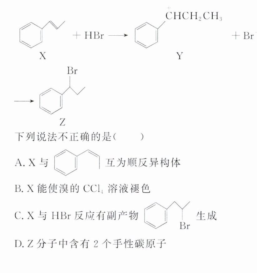 互为顺反异构体,A正确;X中含有碳碳双键,故能使溴的$\mathrm{CCl_4}$溶液褪色,B正确;X中的碳碳双键可以和HBr发生加成反应生成