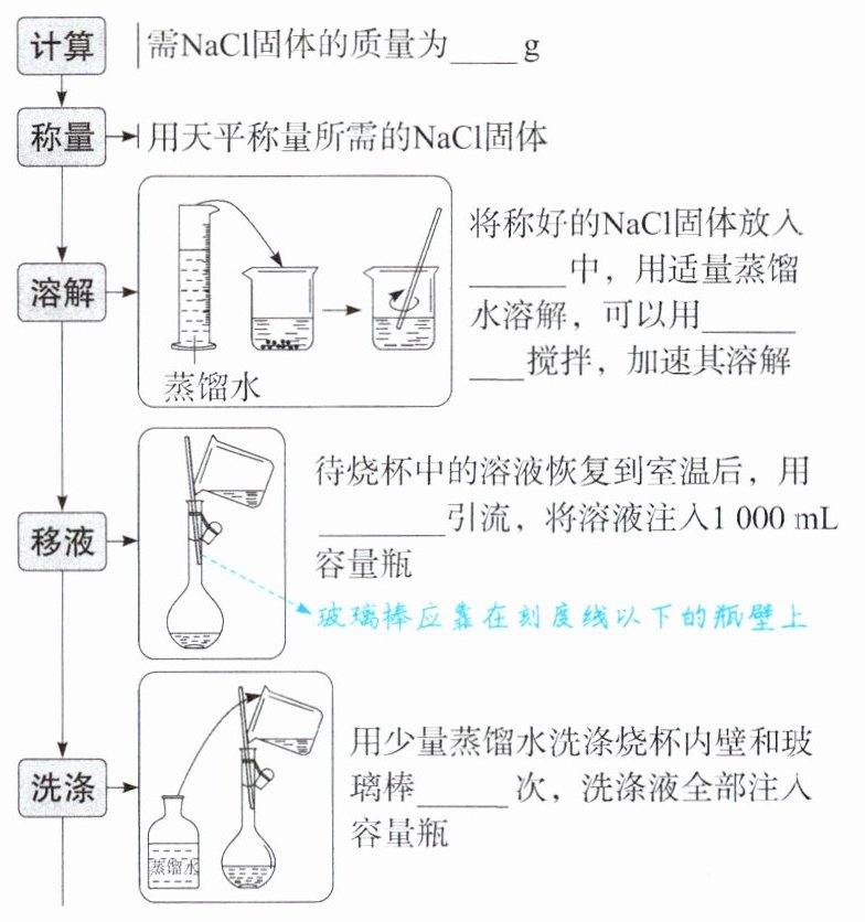 2. 配制一定物质的量浓度的溶液(以配制 1000 mL 1.0 mol·L⁻¹ NaCl 溶液为例)