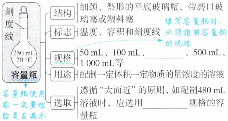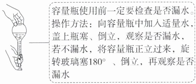 容量瓶使用前一定要检查是否漏水。操作方法:向容量瓶中加入适量水,盖上瓶塞、倒立,观察是否漏水,若不漏水,将容量瓶正立过来,旋转玻璃塞180°、倒立,再观察是否漏水