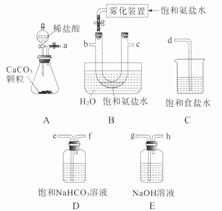 (1)从A~E中选择合适的仪器制备NaHCO₃,正确的连接顺序是________(按气流方向,用小写字母表示)。为使A中分液漏斗内的稀盐酸顺利滴下,可将分液漏斗上部的玻璃塞打开或________。