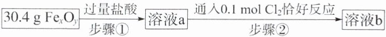 例2 C 解析 该氧化物与盐酸反应后得到含有Fe³⁺和Fe²⁺的溶液,通入氯气后溶液中的Fe²⁺被氧化成Fe³⁻,其反应为2Fe²⁺+Cl₂=\!=\!=2Fe³⁺+2Cl⁻。步骤①为复分解反应,步骤②为氧化还原反应,A正确;由于盐酸过量,则溶液a中阳离子除了Fe³⁺和Fe²⁺外,还有H⁺,B正确;盐酸过量且未知量,故溶液b中Fe³⁺与Cl⁻的物质的量之比无法计算,C错误;步骤②反应为2Fe²⁺+Cl₂=\!=\!=2Fe³⁺+2Cl⁻,其中消耗0.1 mol Cl₂,则Fe²⁺的物质的量为0.2mol,原氧化物中Fe²⁺也为0.2mol,该氧化物中Fe²⁺可认为以FeO的形式存在,其质量为0.2 mol×72 g·mol⁻¹=14.4g,则其中Fe³⁺可认为以Fe₂O₃的形式存在,其质量为(30.4—14.4)g=16g,其物质的量为$\frac{16g}{160g·mol⁻¹}=0.1mol。$则该氧化物可以写成Fe₂O₃·2FeO,即该氧化物的化学式为Fe₃O₄,D正确。
