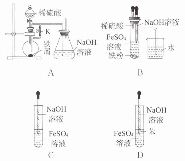 D.实验D,FeSO₄溶液上方的苯层可以隔绝空气,也可以把苯换成四氯化碳
