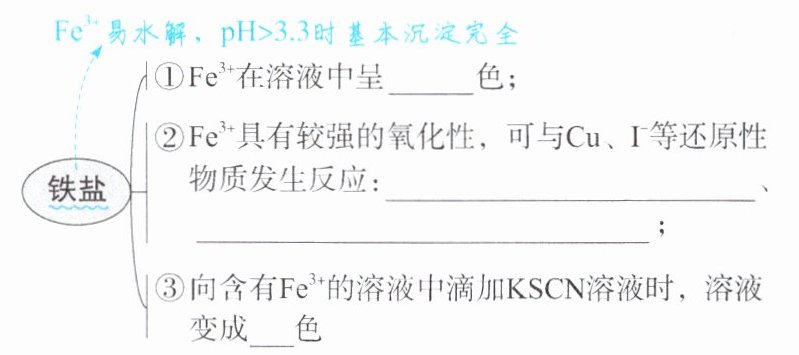 ②Fe³⁺具有较强的氧化性,可与Cu、I⁻等还原性物质发生反应:2Fe³⁺ + Cu = Cu²⁺ + 2Fe²⁺、2Fe³⁺ + 2I⁻ = 2Fe²⁺ + I₂;