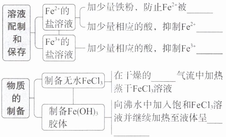 Fe²⁺的盐溶液:加少量铁粉,防止Fe²⁺被氧化;加少量相应的酸,抑制Fe²⁺水解