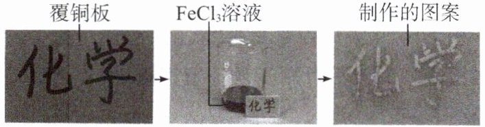 某兴趣小组用油性笔在一小块覆铜板上写上“化学”,然后浸入盛有FeCl₃溶液的小烧杯中,过一段时间后,取出覆铜板,用水洗净并晾干(如图)。