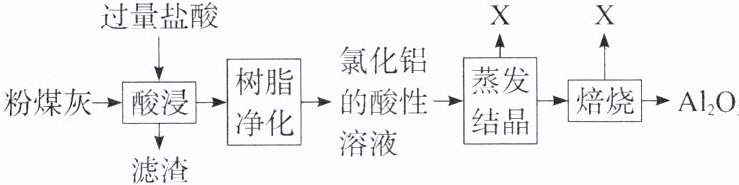 例2 C 解析 由流程可知,加盐酸反应后,过滤分离出的"滤渣"主要为SiO₂,酸浸液中含Al³⁺、Fe³⁺、Ca²⁺,"树脂净化"除去了Fe³⁺、Ca²⁺,AlCl₃的酸性溶液可抑制Al³⁺水解,蒸发结晶分离出X为HCl,焙烧结晶之后所得物质生成Al₂O₃和X(HCl)。"滤渣"的主要成分是SiO₂,A正确;由制备最终产物Al₂O₃及流程可知,"树脂净化"的目的是将Al³⁺与Fe³⁺、Ca²⁺分离,B正确;"酸浸"时盐酸过量,"蒸发结晶"前溶液显酸性,因此不需要加盐酸,C错误;X为HCl,可在"酸浸"时循环使用,循环使用X既能降低成本,又能防止污染环境,D正确。