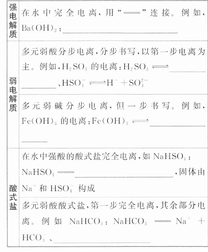 (2)$Ba(OH)_2=Ba^{2+} + 2OH^-$ $H^+ + HSO_3^-$ $Fe^{3+} + 3OH^-$ $Na^+ + H^+ + SO_4^{2-}$ $HCO_3^- \rightleftharpoons H^+ + CO_3^{2-}$