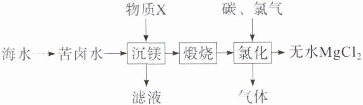 6.D 解析 物质X的作用是使Mg²⁺转化为Mg(OH)₂,工业上一般涉及反应CaO+H₂O════Ca(OH)₂(石灰乳),Ca(OH)₂(石灰乳)+Mg²⁺════Mg(OH)₂+Ca²⁺,A正确;Mg是较活泼金属,工业上常电解熔融MgCl₂制备金属镁,B正确;“氯化”过程反应物为MgO、氯气、C,生成物之一为MgCl₂,C在高温下能将二氧化碳还原为CO,则“气体”为CO,化学方程式为MgO+C+Cl₂高温════MgCl₂+CO,C正确;“煅烧”后得到MgO,MgO和盐酸反应得到MgCl₂溶液,由于MgCl₂在溶液中水解为氢氧化镁和HCl,将所得溶液加热蒸发时HCl会逸出,MgCl₂水解平衡正向移动,得到氢氧化镁,得不到无水MgCl₂,D错误。