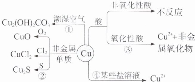 (1)紫红 导热 导电$ (2)①2Cu + O₂ + CO₂ + H₂O ——Cu₂(OH)₂CO₃ ②2Cu + S \stackrel{\triangle}{=} Cu₂S ③3Cu + 8H⁺ + 2NO₃——3Cu²⁺ + 2NO↑ + 4H₂O Cu + 4H⁺ + 2NO₃ ——Cu²⁺ +2NO₂↑ + 2H₂O ④Cu + 2Fe³⁺——2Fe²⁺ + Cu²⁺$