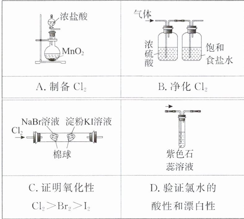 例D 解析用${MnO2}$与浓盐酸制备${Cl2}$需要加热,缺少酒精灯,A错误;净化${Cl2}$应先通入饱和食盐水,再通入浓硫酸干燥,B错误;${Cl2}$能与${NaBr}$反应,同时能与${KI}$反应,不能确定是${Cl2}$还是${Br2}$与${KI}$反应,不能证明氧化性${Cl2}>{Br2}>{I2}$,C错误;氯气通入紫色石蕊溶液中先变红后褪色,验证氯水的酸性和漂白性,D正确。