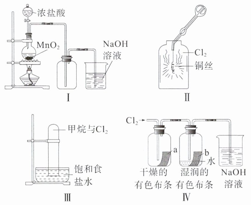 对点训练C 解析用二氧化锰和浓盐酸反应制备氯气时,因浓盐酸逐渐变稀后与二氧化锰不反应,浓盐酸不可能消耗完,A正确;铜丝在氯气中燃烧,生成${CuCl2}$固体,产生棕黄色的烟,B正确;光照条件下,甲烷与氯气发生取代反应,C错误;氯气与水反应生成的次氯酸可使有色布条褪色,过量的氯气进入烧杯中和氢氧化钠反应生成氯化钠和次氯酸钠,再向烧杯中滴加浓硫酸,至溶液显酸性时,${Cl-}$、${ClO-}$和${H+}$可发生反应生成氯气,D正确。