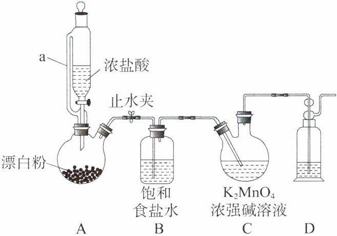 4.B 解析a的作用是平衡气压,使浓盐酸顺利滴下,A正确;装置B中饱和食盐水的目的为除去${Cl2}$中的${HCl}$,换为浓硫酸后只能起干燥作用,不能除去${Cl2}$中的${HCl}$,B错误;装置D的目的是吸收反应过程中过量的氯气,防止污染环境,反应原理为${2NaOH + Cl2 \xlongequal{} NaCl + NaClO + H2O}$,C正确;在强碱性条件下,发生反应:${Cl2 + 2K2MnO4 \xlongequal{} 2KMnO4 + 2KCl}$,反应中${Cl2}$为氧化剂,${KMnO4}$为氧化产物,故氧化性:${Cl2}>{KMnO4}$,D正确。