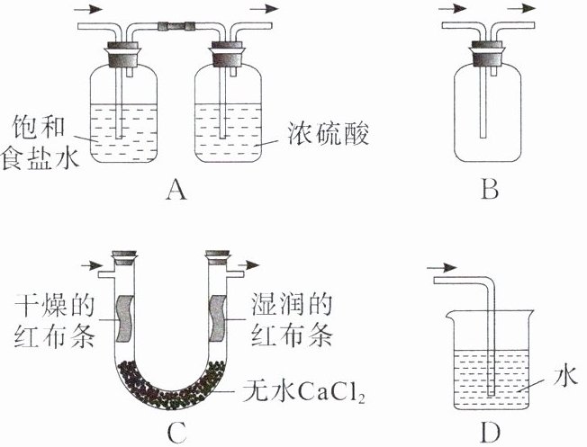 5.D 解析浓盐酸易挥发,制备的氯气中含有${HCl}$,可用饱和食盐水除去${HCl}$,${Cl2}$可用浓硫酸干燥,A正确;氯气的密度大于空气,用向上排空气法收集,B装置能收集氯气,B正确;湿润的红布条褪色,干燥的红布条不褪色,可验证干燥的氯气不具有漂白性,C正确;氯气在水中的溶解度较小,可以用${NaOH}$溶液吸收尾气,D装置不能达到实验目的,D错误。
