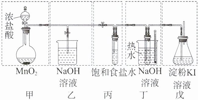 2.A 解析装置甲中浓盐酸和二氧化锰反应生成氯气,但该反应需要在加热的条件下进行,A错误;氯气能够和${NaOH}$溶液反应,可以用装置乙处理多余的氯气,B正确;生成的氯气中混有${HCl}$气体,可以用饱和食盐水除去氯气中的${HCl}$气体,C正确;氯气具有氧化性,能够和${KI}$溶液反应生成${I2}$,淀粉遇${I2}$变蓝,可以用装置戊检验氯气,D正确。