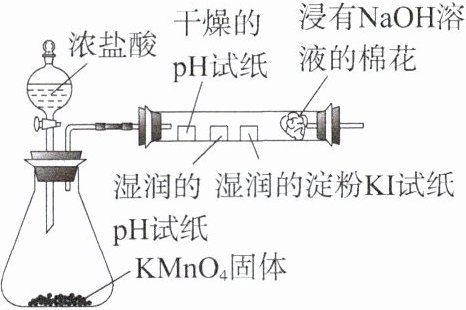 3.C 解析高锰酸钾和浓盐酸反应:${2KMnO4 + 16HCl(浓)\xlongequal{}2KCl + 2MnCl2 + 5Cl2\uparrow + 8H2O}$,参与反应的${HCl}$一部分被氧化为${Cl2}$,另一部分体现了酸性,A错误;酸使$pH$试纸变色发生的不是氧化还原反应,B错误;观察到淀粉${KI}$试纸变蓝,说明${Cl2}$具有氧化性,发生反应${2I- + Cl2 \xlongequal{} I2 + 2Cl-}$,C正确;氯气与水反应生成的盐酸是强酸,次氯酸具有漂白性,故湿润的$pH$试纸先变红后褪色,D错误。