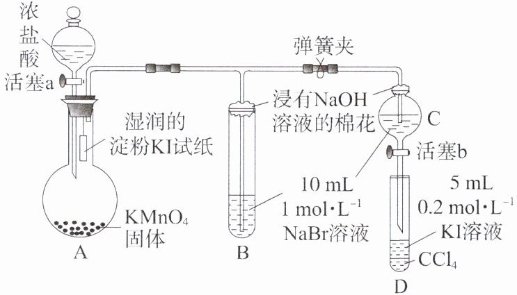 (4)打开活塞b,将少量C中溶液滴入D中,关闭活塞b,取下D振荡,静置后$CCl_{4}$层变为紫红色